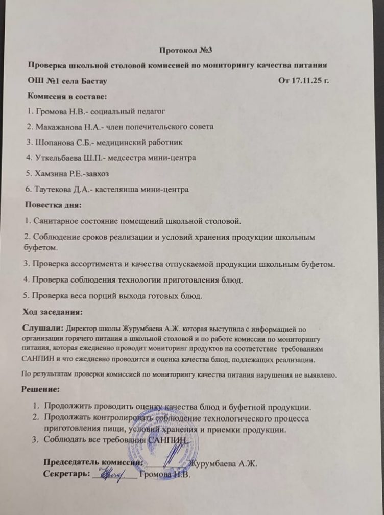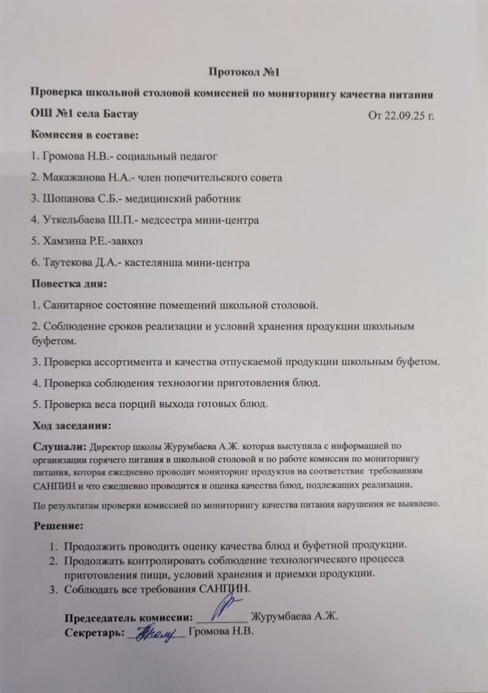 2025-2026 оқу жылына тамақтану мониторингі бойынша протоколдар
